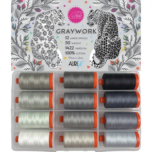 Coffret de 12 grandes bobines Graywork par Tula Pink / Aurifil TP50GW12